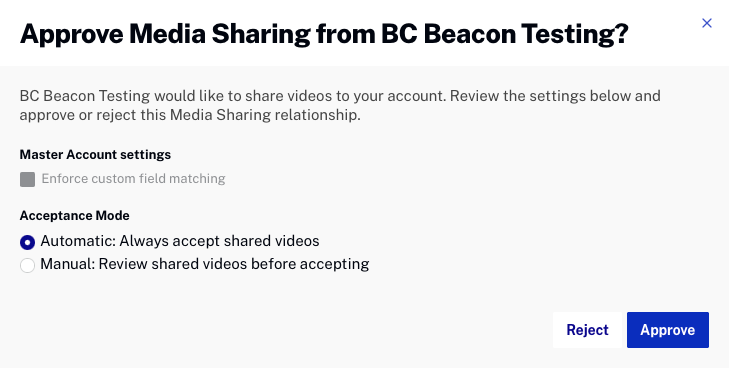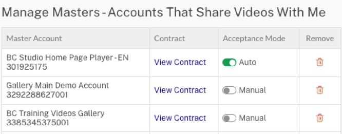 - 自動 - このマスターアカウントから共有された動画を常に自動的に受け入れます。共有動画は Media モジュールの動画一覧に表示されます。