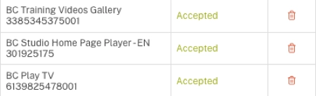 追加されたアカウントは、関係ステータスが保留中の状態でテーブルに表示されます。アフィリエイト アカウントにはメディア共有通知が届き、共有関係を承認または拒否することができます。アフィリエイトが共有関係を承認すると、関係ステータスは承認になります。