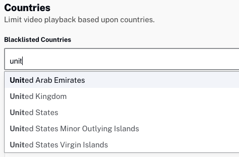- 視聴を禁止(ブラックリスト)または許可(ホワイトリスト)したい国を選択します。入力中に候補が絞り込まれます。