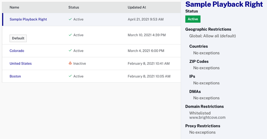 地域制限を使用すると、国、郵便番号、IPアドレス、指定マーケットエリア(DMA)に基づいて動画の再生を制限できます。再生権限に地域制限を設定するには、以下の手順に従ってください: