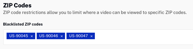 - 視聴を禁止または許可したい郵便番号を入力します。郵便番号には、2文字の大文字の国コードとハイフンを付けてください(例:US-90045)。