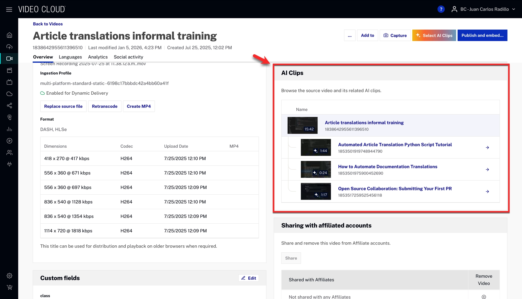 元動画および生成されたクリップの両方の[概要]タブに AI クリップ セクションが表示され、親動画とクリップ間を素早く移動できます。