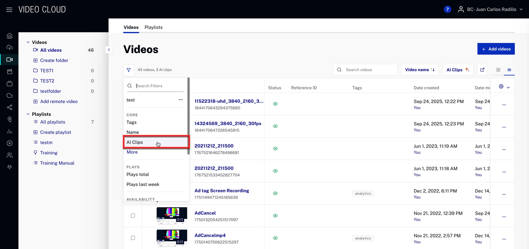 テーブル上部の AI クリップ ボタンをクリックすると、AI クリップ付き動画 フィルターが自動的に有効になります。