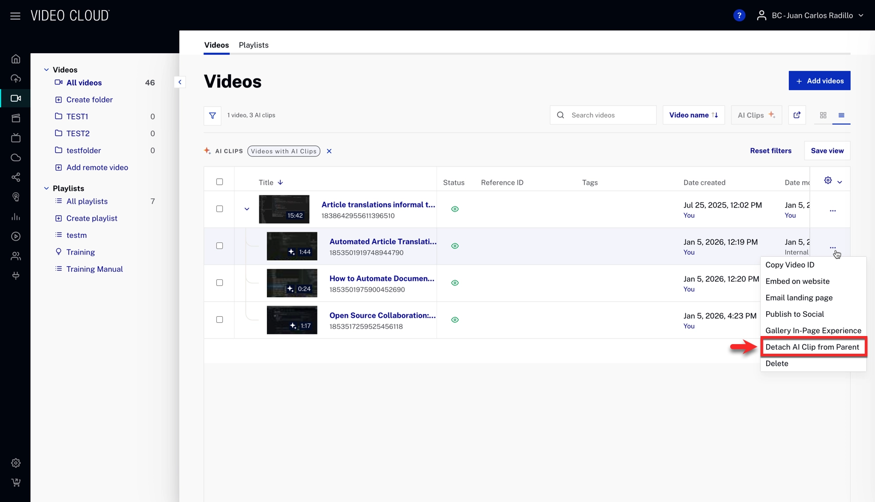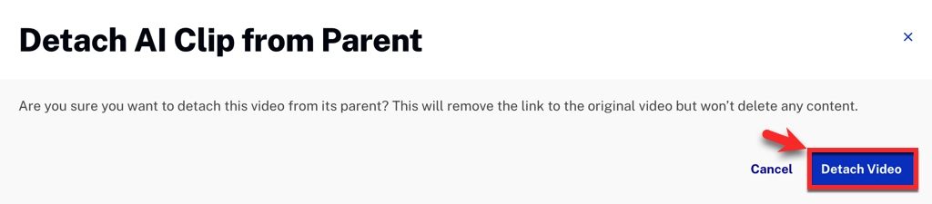 クリップを親動画から切り離して、単独の動画として作成できます。この操作により、元動画との関連付けは解除されますが、コンテンツが削除されることはありません。