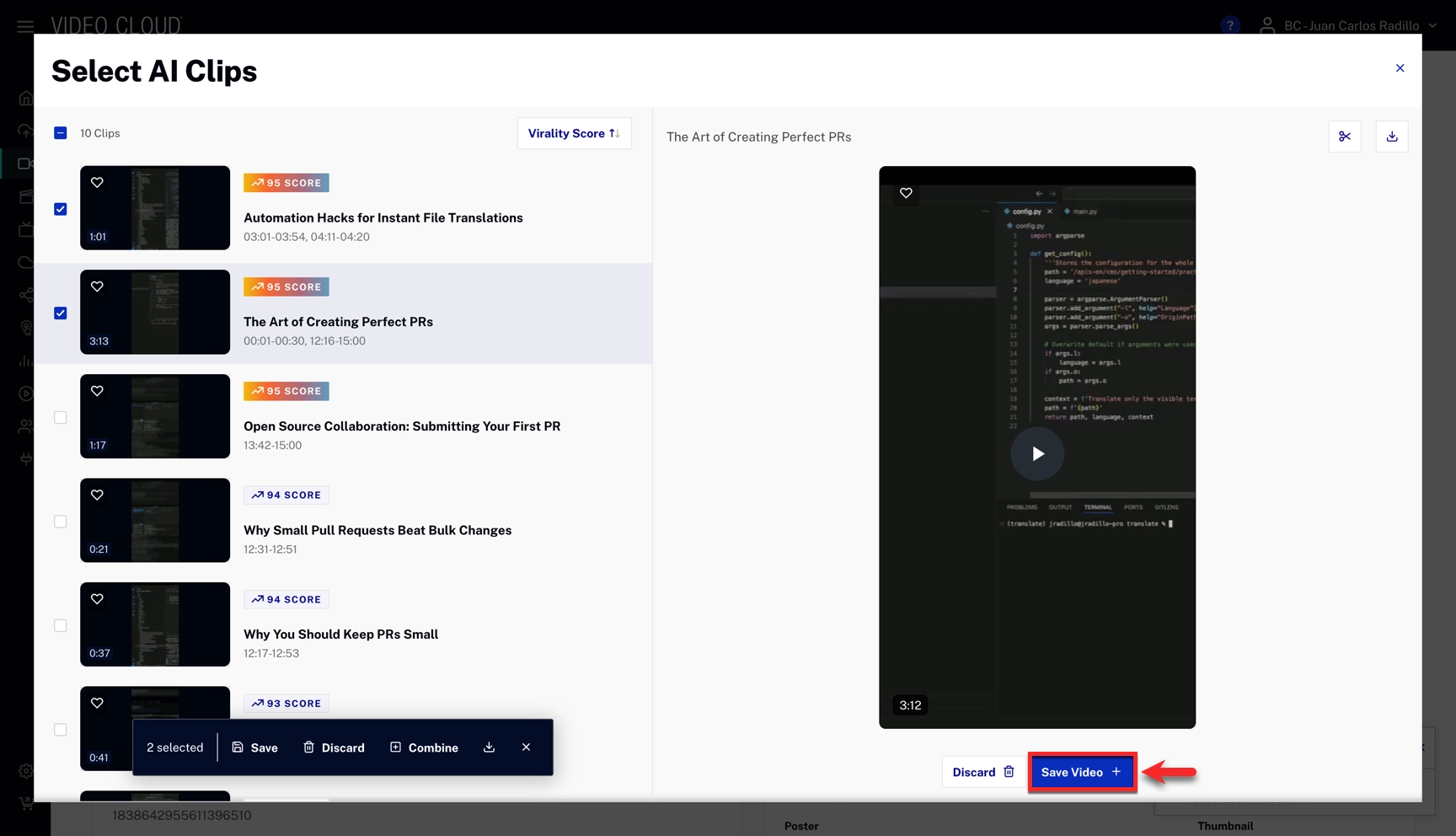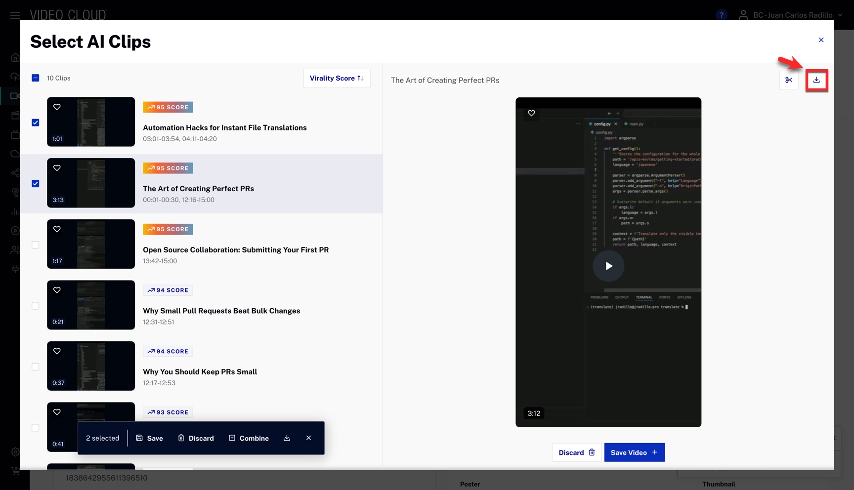 生成が完了すると、クリップをプレビューし、ダウンロードまたは取り込みを行うクリップを選択できます。