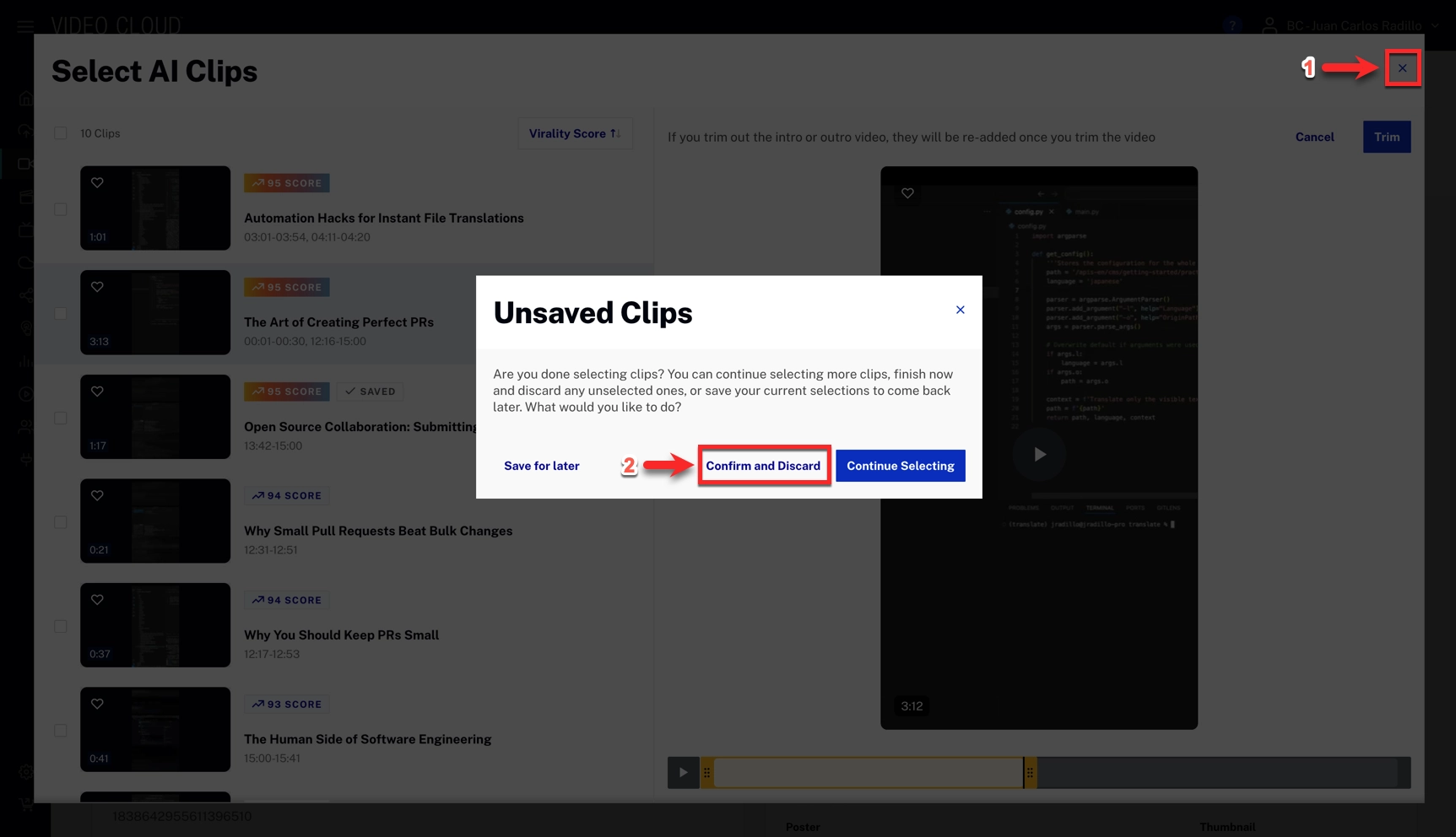 すでにクリップが生成されている動画で追加のクリップを生成する場合は、クリップ選択モーダルを閉じて、次を選択します。