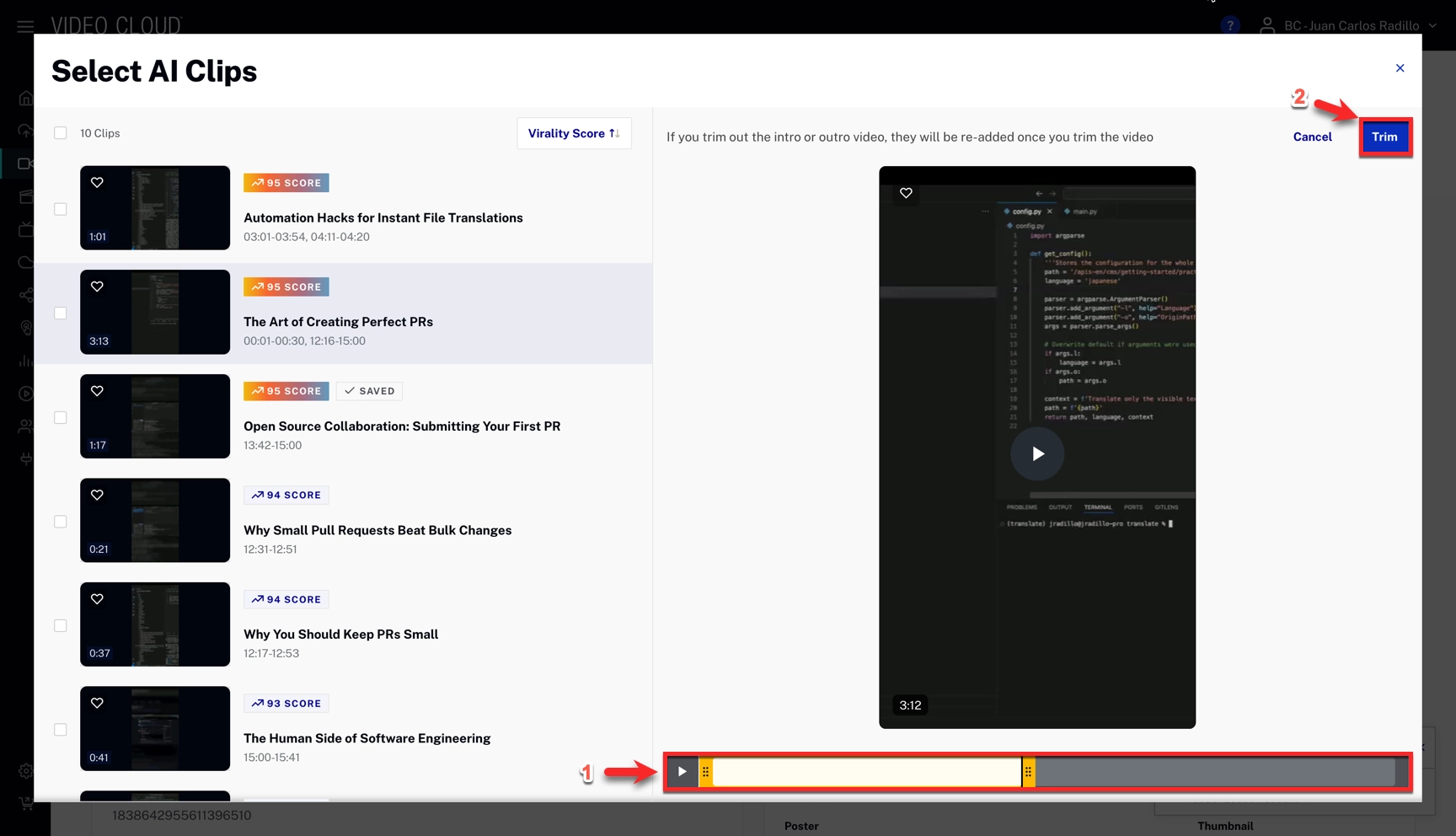 バイラリティ スコアは、感情的なインパクト、トレンドとの一致度、共有しやすさ、ストーリーの分かりやすさなどの要素に基づいて、クリップのエンゲージメント度を推定します。