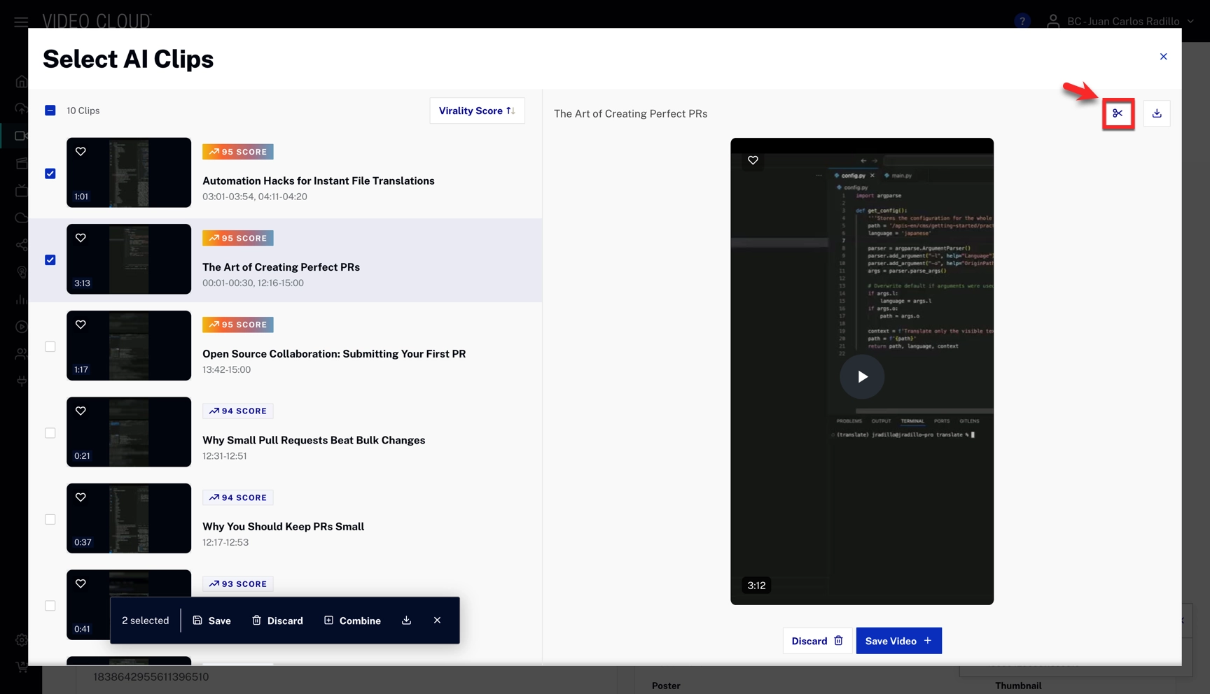 - 動画を保存: 動画を、その動画の AI クリップ セクションに保存します。