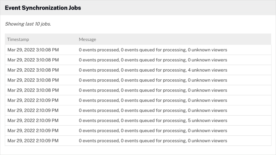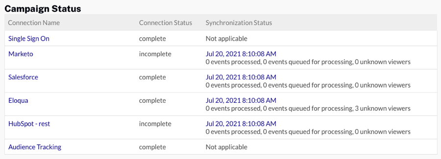 Synchronization Activity オプションでは、Campaign からマーケティングオートメーションプラットフォームに同期された直近 10 件のジョブが表示されます。同期は 1 時間ごとに実行されます。接続を選択し、Test Sync ボタンをクリックすると同期を実行できます。これは新しい統合をテストする際に便利で、イベントデータが正しく送信されているかを待たずに確認できます。Test Sync は 5 分ごとに 1 回、1 時間に最大 10 回まで実行可能です。