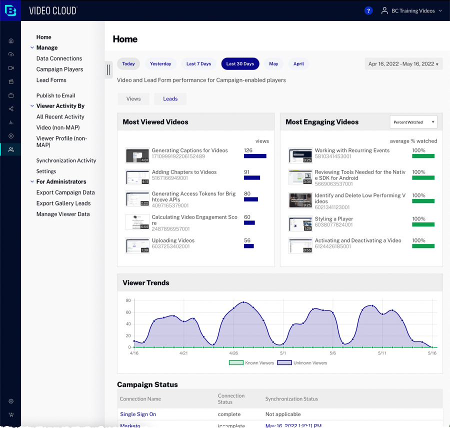 Campaign モジュールにアクセスするには、Video Cloud にログインし、メインナビゲーションでCampaign をクリックします。Campaign ホームページには、動画がどのくらい視聴されたか、どの動画が視聴されたか、誰が視聴したかといったエンゲージメントデータが表示されます。これにより、視聴者とのエンゲージメントを高め、コンバージョンにつなげることができます。