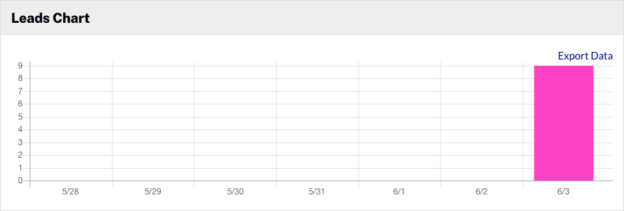 「リードチャート」では、選択した期間におけるリードフォームの提出数が日ごとに表示されます。グラフにカーソルを合わせると、実際のデータポイントが表示されます。