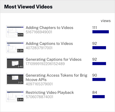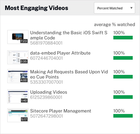 「最もエンゲージメントの高い動画」チャートには、選択した期間において Campaign 対応プレーヤーで最もエンゲージメントの高い動画が表示されます。エンゲージメントは平均視聴率で表されます。動画エンゲージメントの算出方法については、トレーニング動画 Calculating Video Engagement Score をご覧ください。
