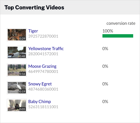 「コンバージョン率が最も高い動画」チャートには、コンバージョン率が最も高い動画が表示されます。コンバージョン率は、提出されたリードフォーム数を動画インプレッション数で割ることで算出されます。