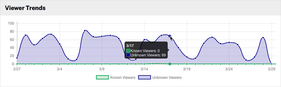 「視聴者の傾向」チャートには、選択した期間における動画の視聴回数が表示されます。既知の視聴者と匿名視聴者の両方が含まれます。グラフにカーソルを合わせると、実際のデータポイントが表示されます。